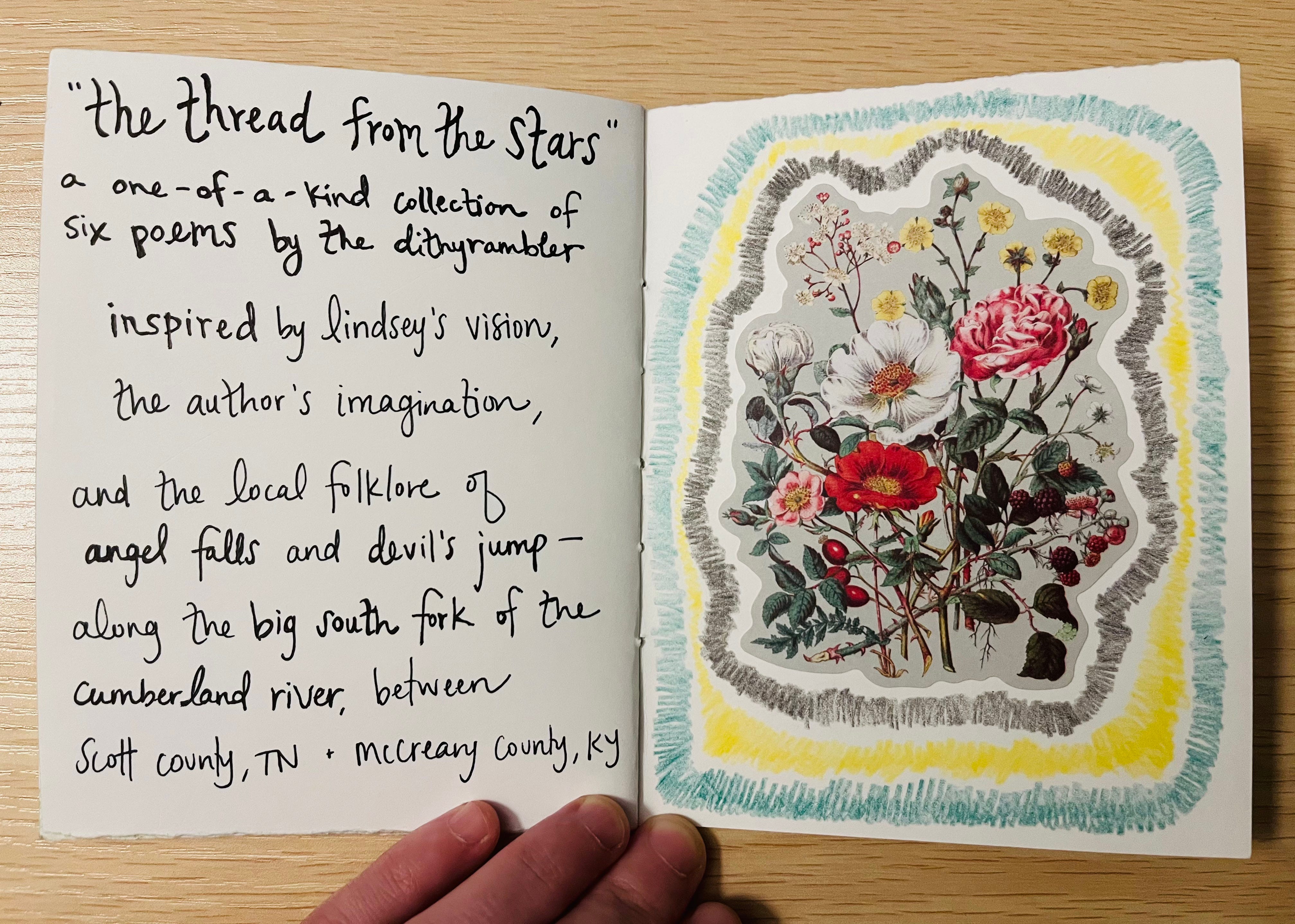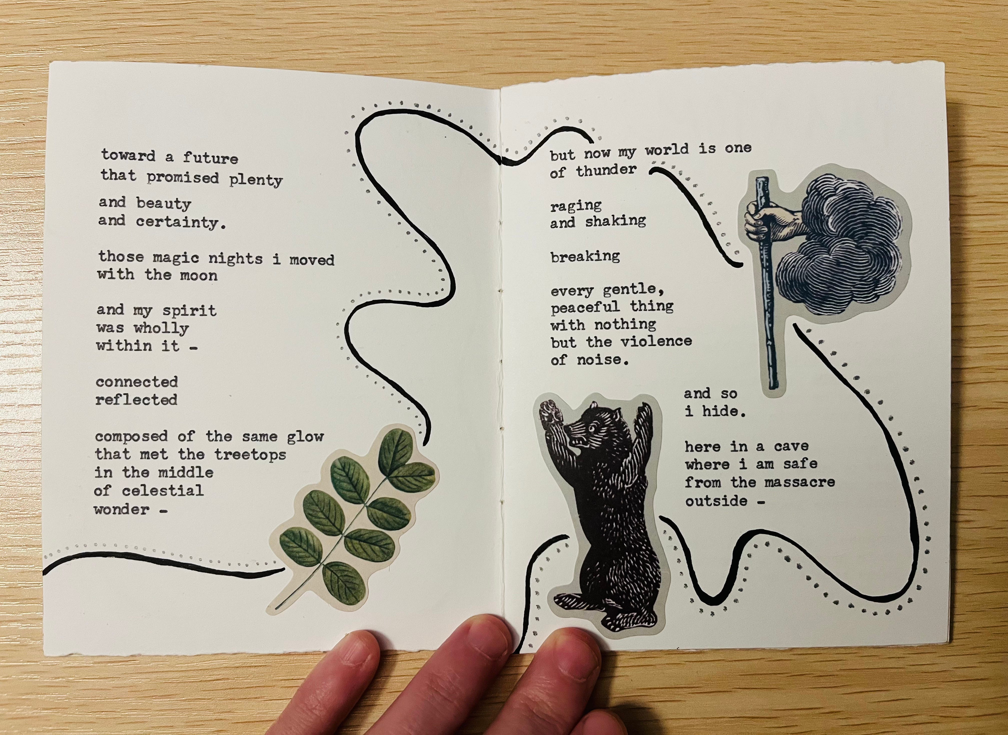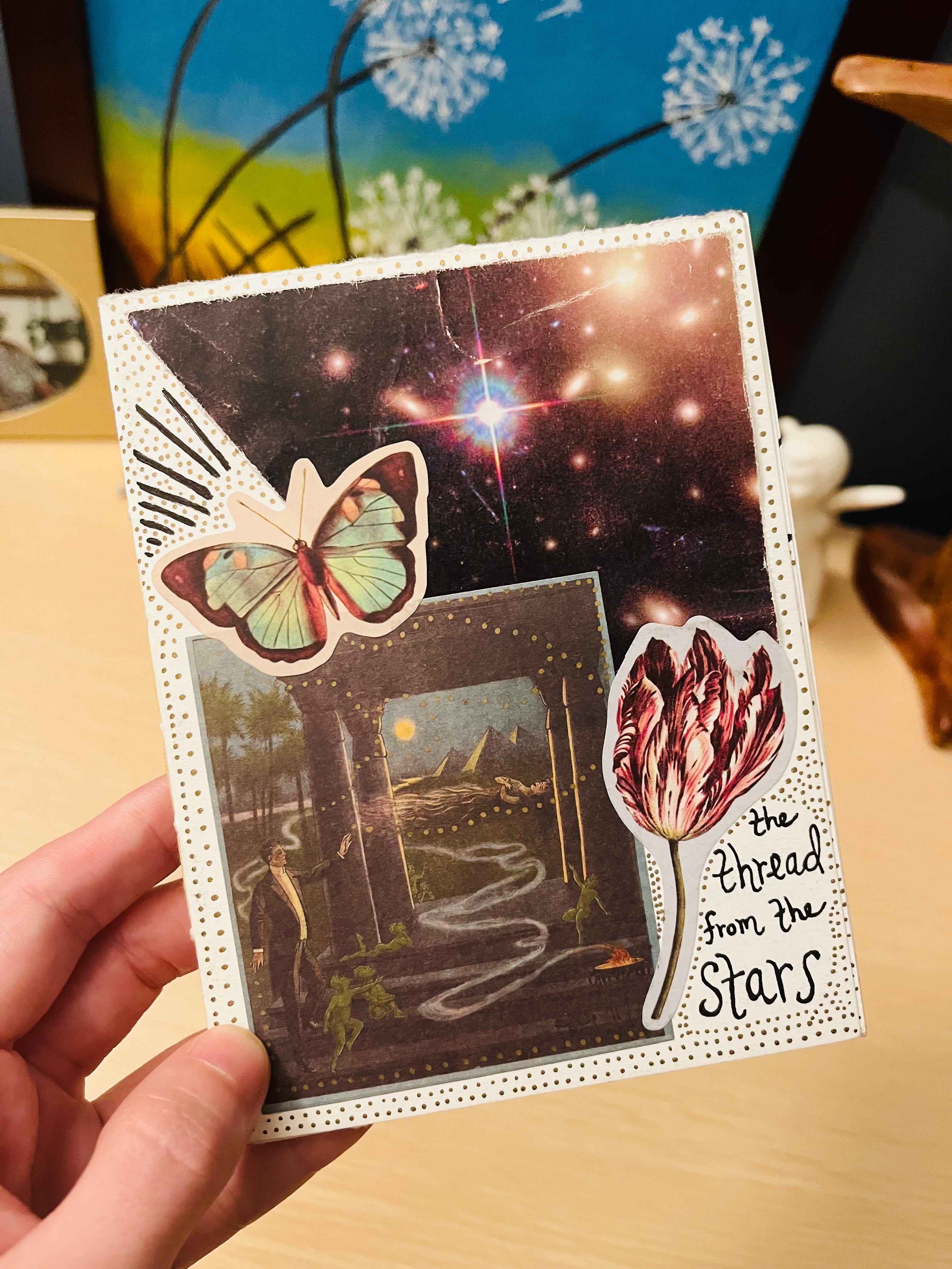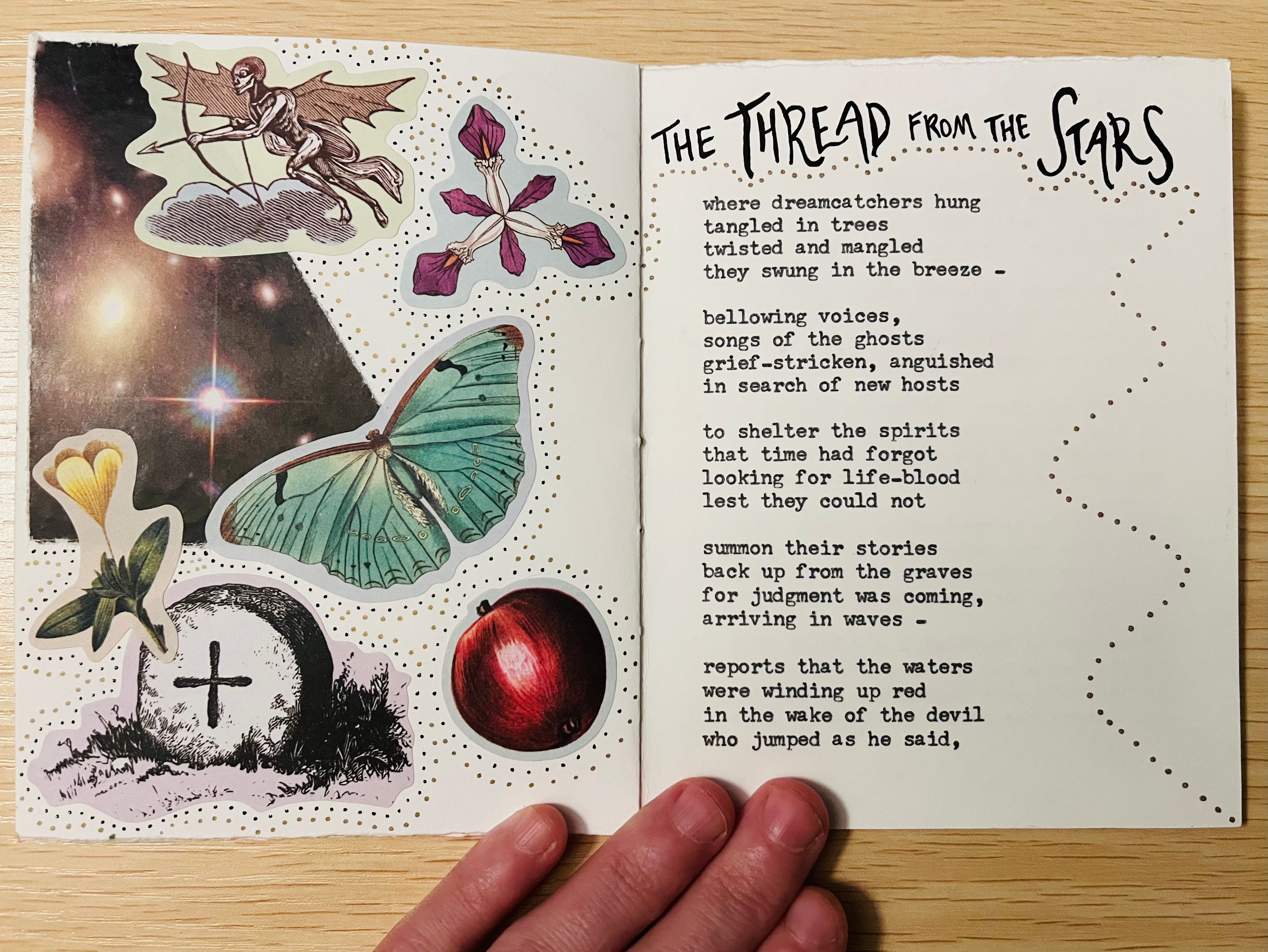 the thread from the stars – My very first handmade book commission is complete! Featuring six original poems, collage art and illustrations, this one-of-a-kind collection is dedicated to my friend Lindsey, whose vision brought this work to life. Equal parts eerie & ethereal, the setting she pictured brings us to a haunted forest: where dreamcatchers hung / tangled in trees / twisted and mangled / they swung in the breeze…