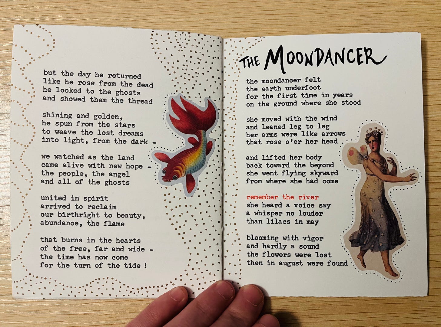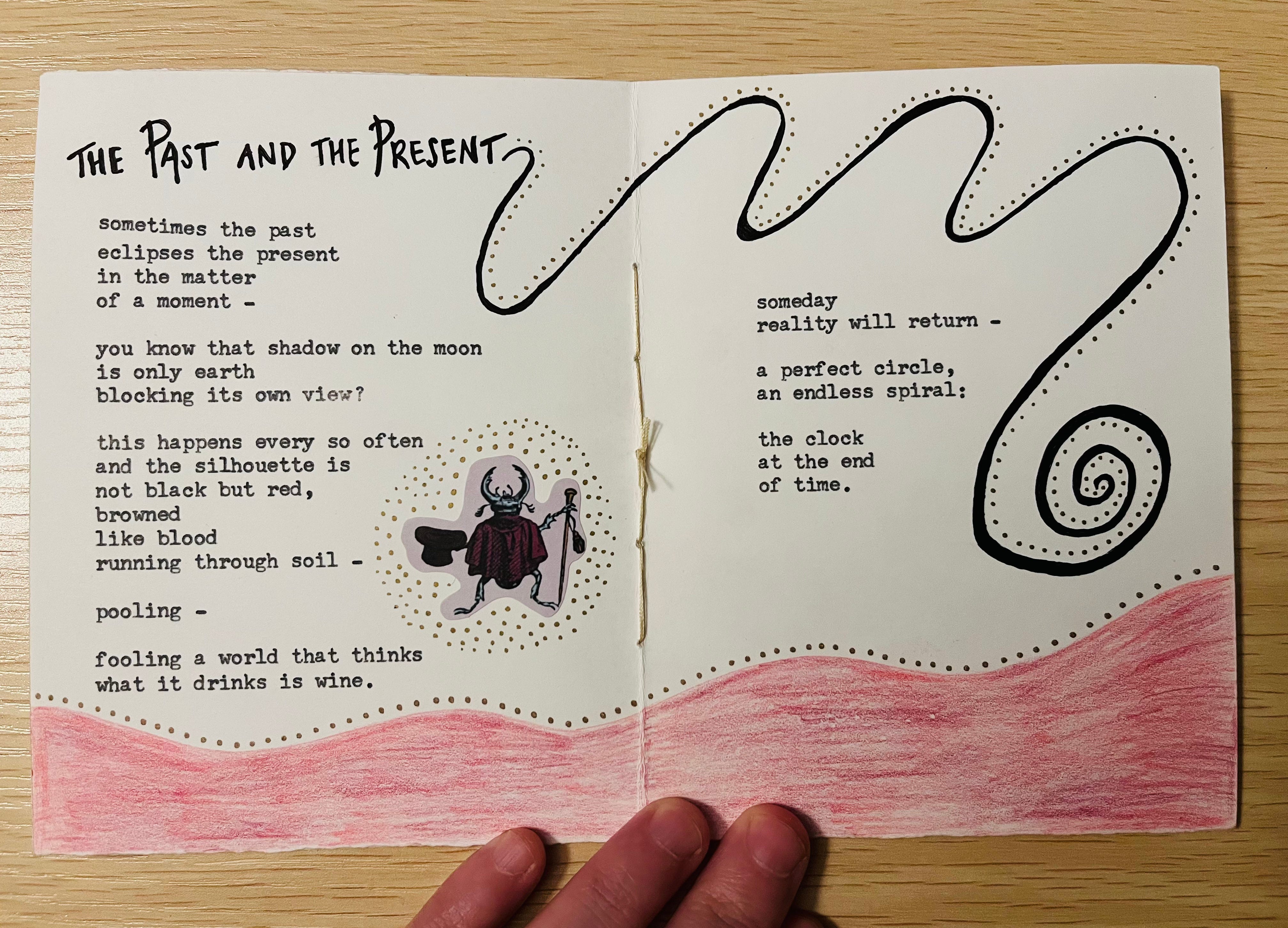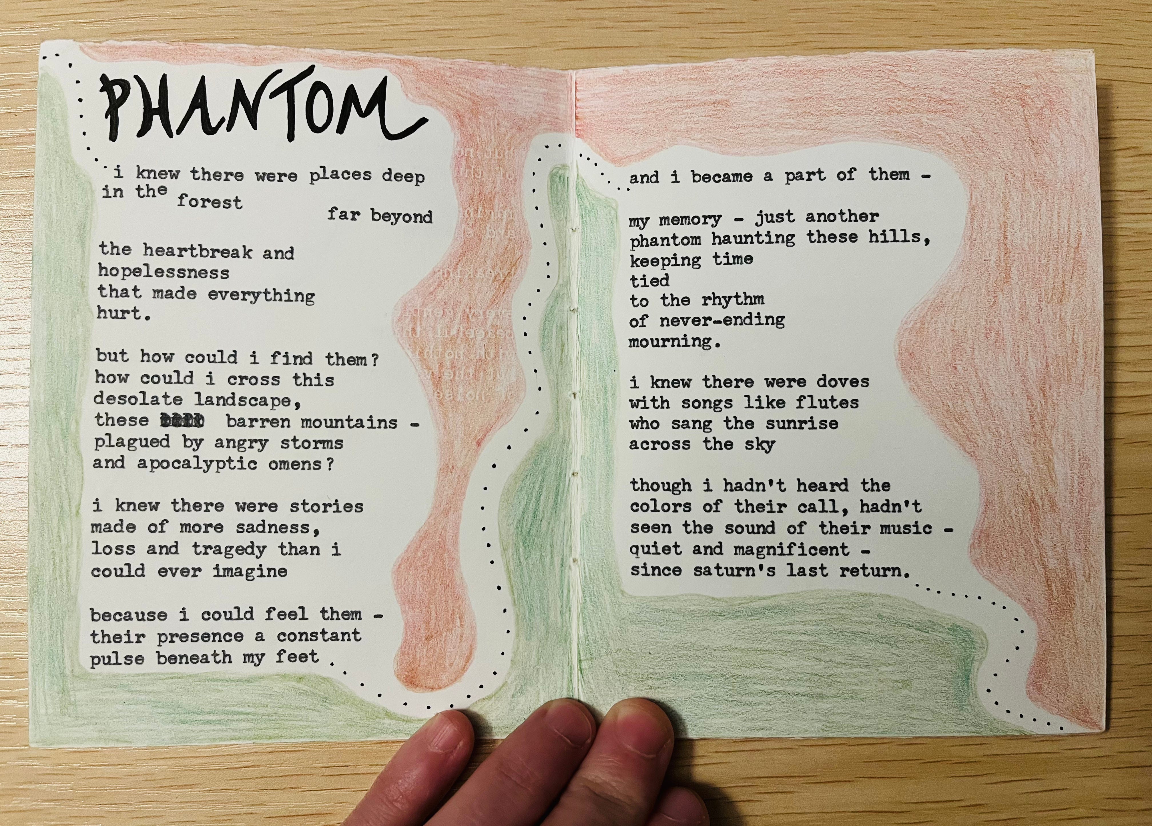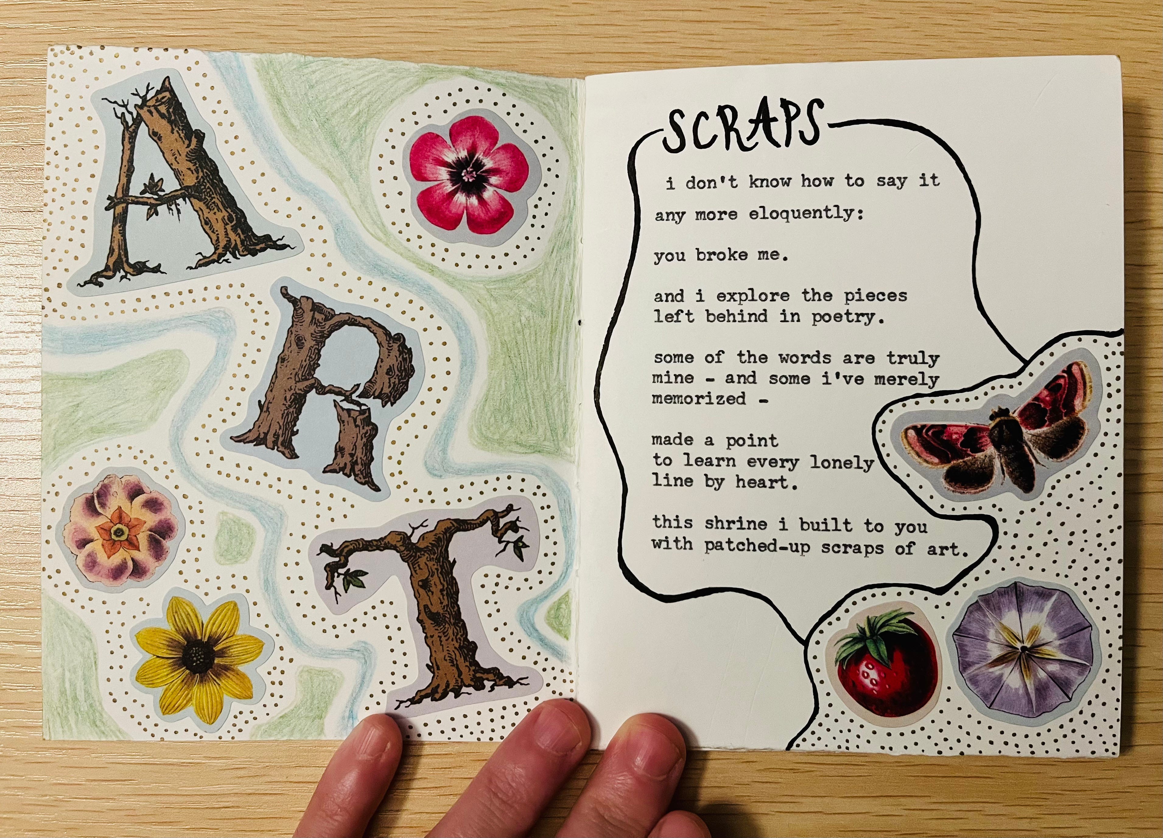 the thread from the stars – My very first handmade book commission is complete! Featuring six original poems, collage art and illustrations, this one-of-a-kind collection is dedicated to my friend Lindsey, whose vision brought this work to life. Equal parts eerie & ethereal, the setting she pictured brings us to a haunted forest: where dreamcatchers hung / tangled in trees / twisted and mangled / they swung in the breeze…
