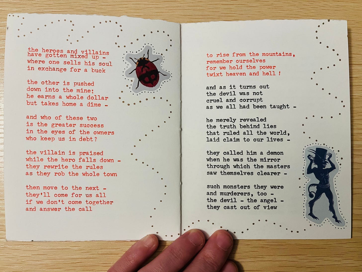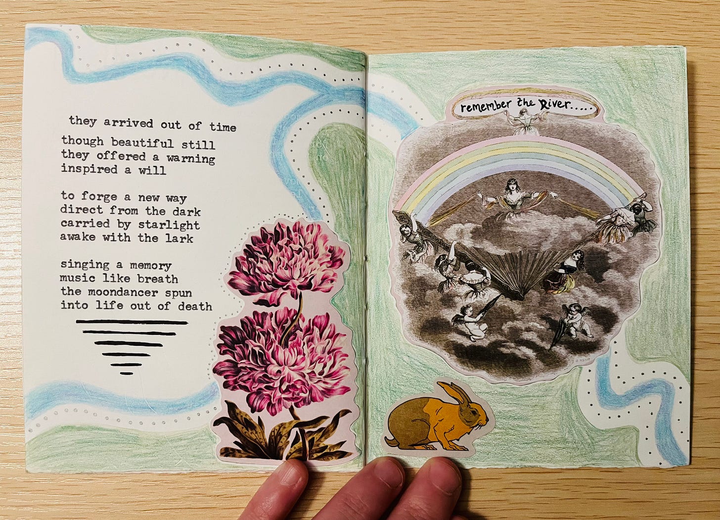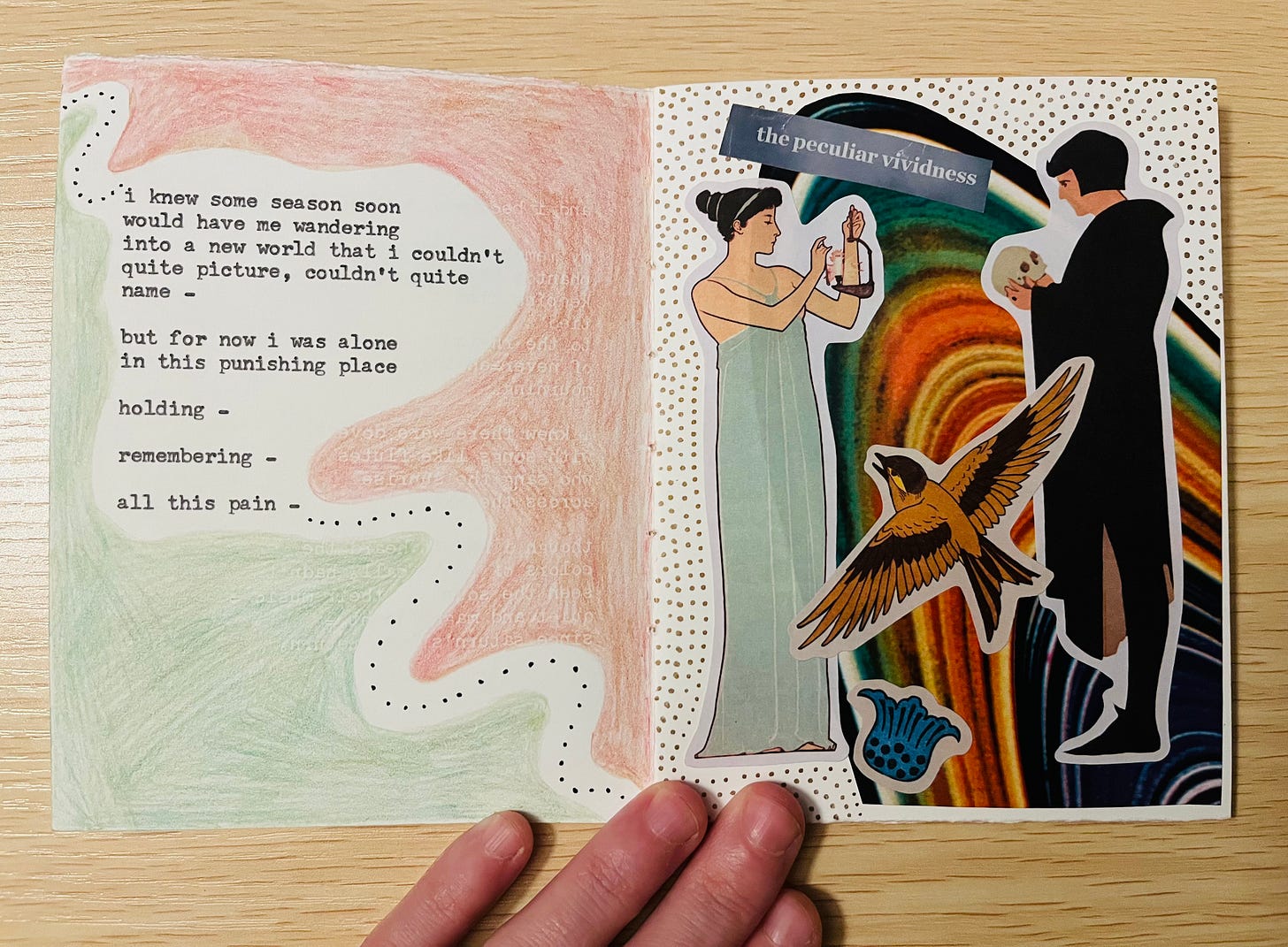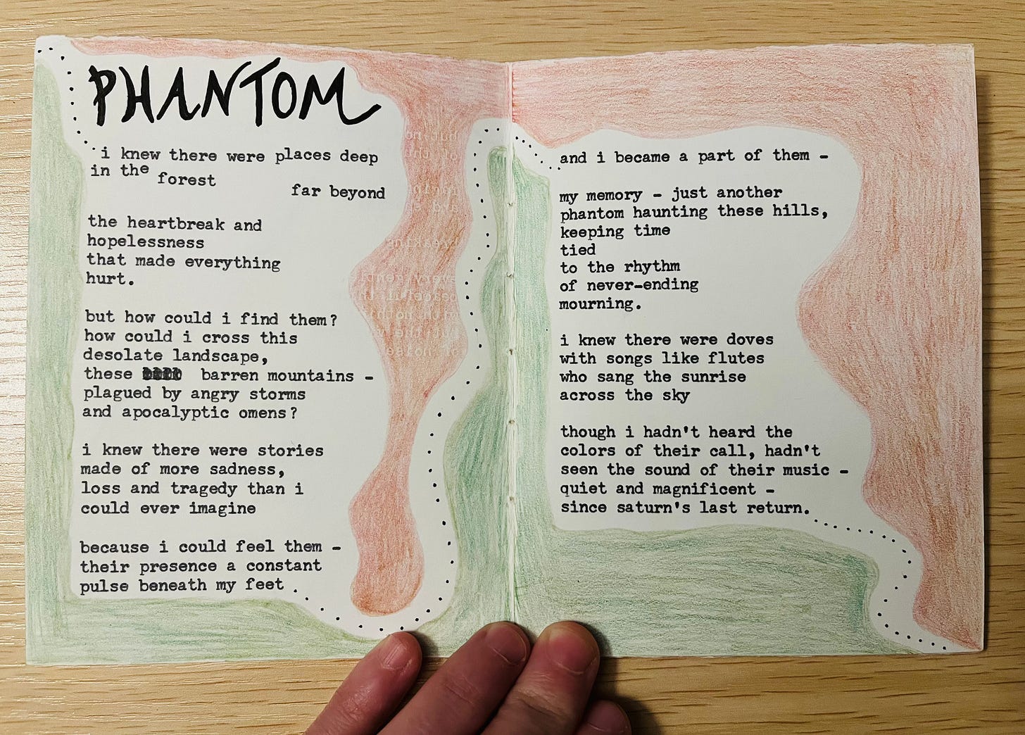 the thread from the stars – My very first handmade book commission is complete! Featuring six original poems, collage art and illustrations, this one-of-a-kind collection is dedicated to my friend Lindsey, whose vision brought this work to life. Equal parts eerie & ethereal, the setting she pictured brings us to a haunted forest: where dreamcatchers hung / tangled in trees / twisted and mangled / they swung in the breeze…